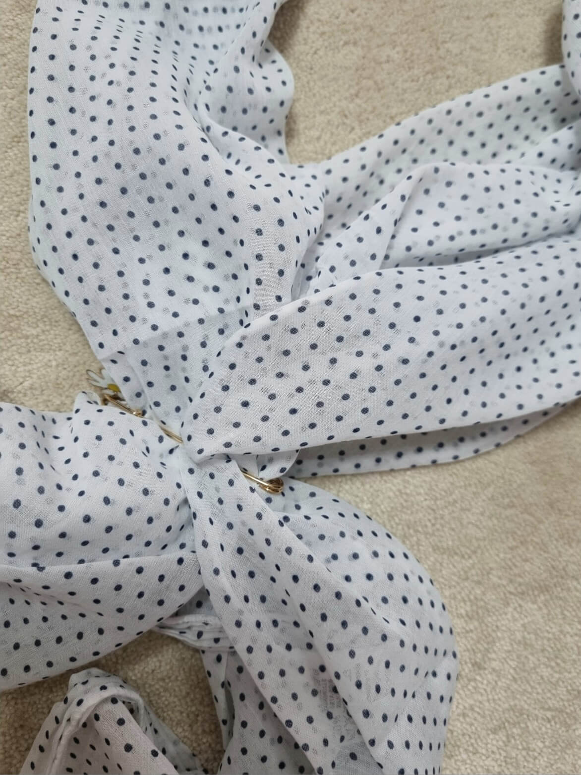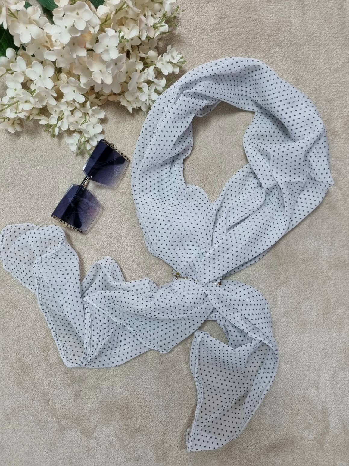 Dodaj tej stylizacji dziewczęcego uroku! Apaszka w kropeczki to idealny dodatek na lato – lekka, delikatna i pełna wdzięku. Wystarczy jeden gest, by dodać sobie szyku.