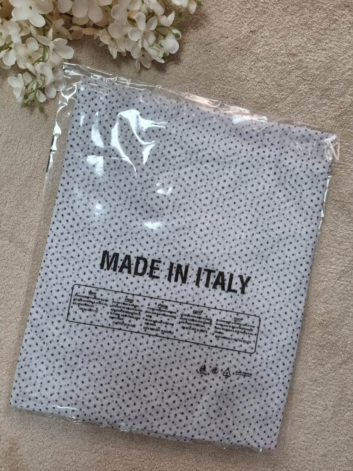 Delikatna, kobieca i niezwykle uniwersalna – ta cienka apaszka-szal w drobne granatowe kropeczki to idealny wybór na ciepłe dni. Dzięki asymetrycznemu krojowi oraz lekkości materiału możesz nosić ją na wiele sposobów: jako ozdobę na szyję, stylowe wiązanie na głowę lub jako modny akcent przewiązany przy torebce. Włoska produkcja gwarantuje jakość i wyjątkowy styl, który pokochasz od pierwszego dotyku.