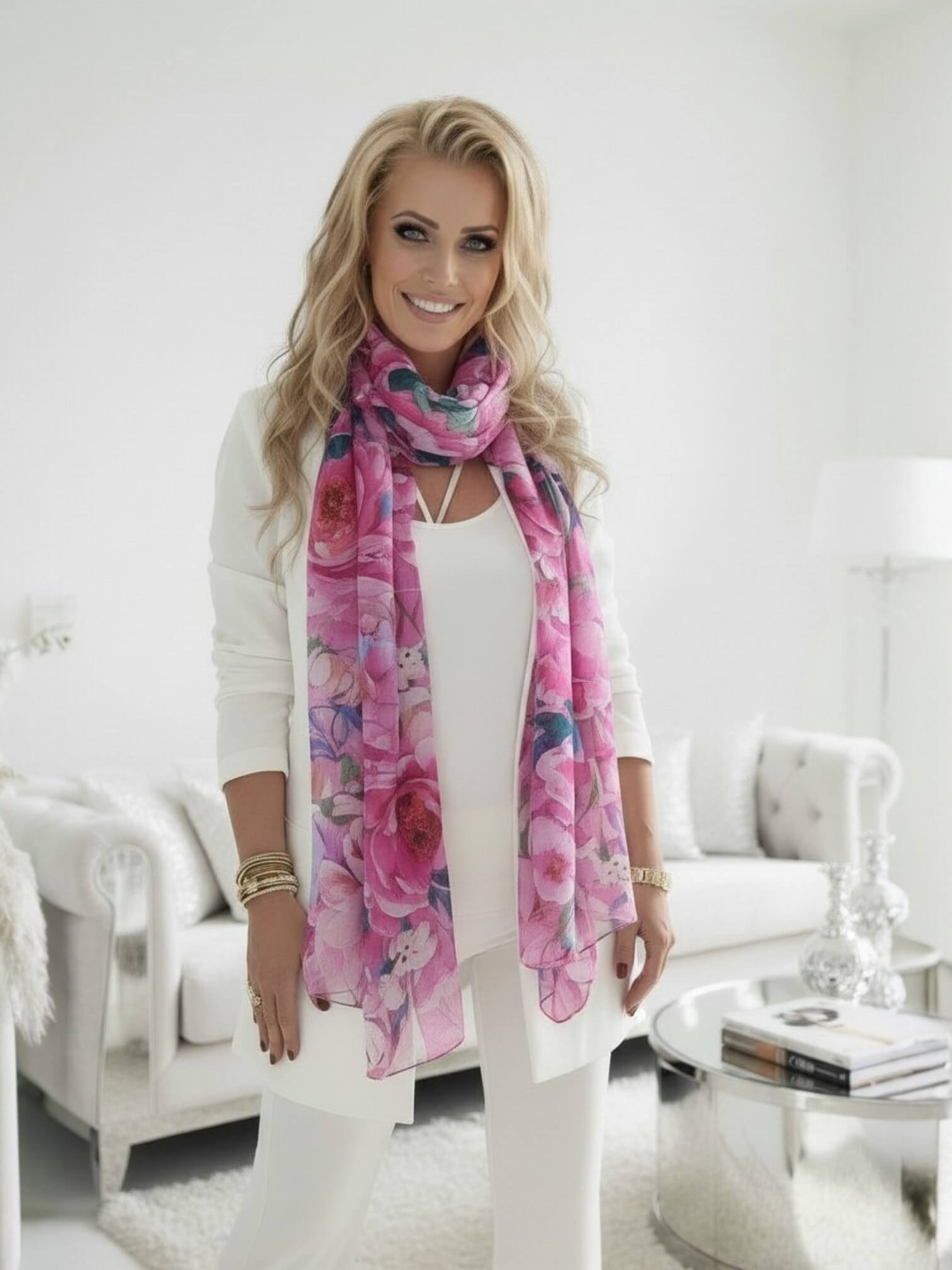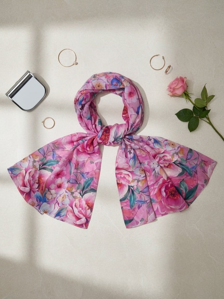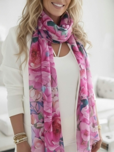 Apaszka Szal Florisena to wyjątkowo kobiecy dodatek, który zachwyca dużym formatem i efektownym, kwiatowym wzorem. To model, który od razu przyciąga wzrok piękną kompozycją dużych różowych kwiatów oraz świeżych, wyrazistych akcentów kolorystycznych.
