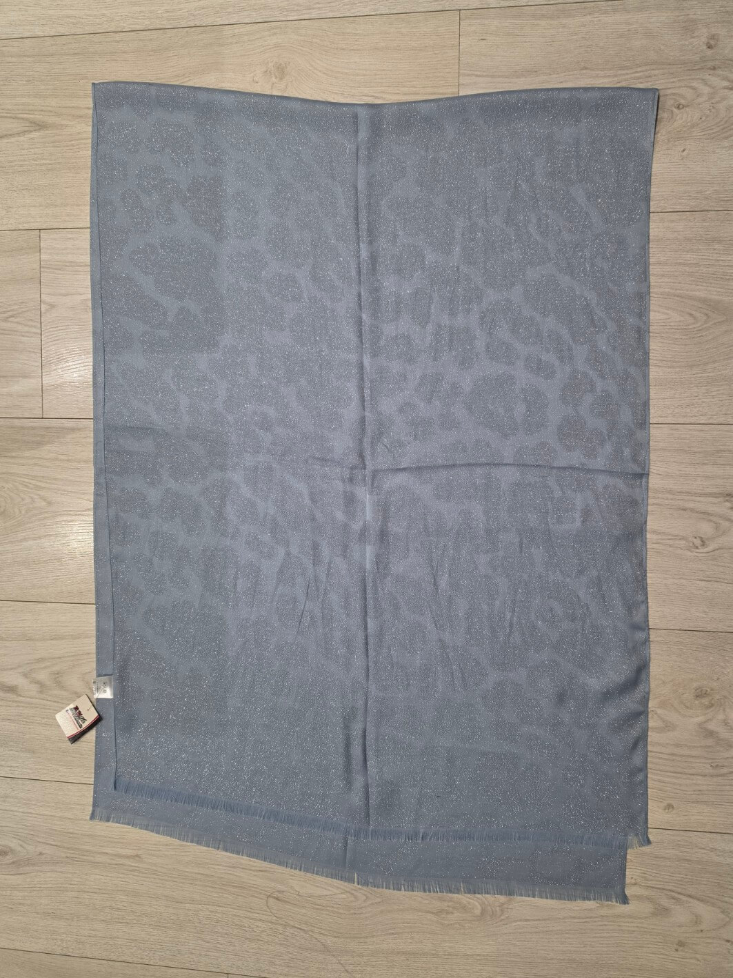 Całość została ozdobiona delikatnym, wytłaczanym wzorem oraz drobniutką metalizowaną nitką, która miękko odbija światło i nadaje tkaninie eleganckiego połysku. Dzięki temu apaszka prezentuje się bardzo szykownie, ale nadal pozostaje subtelna i uniwersalna.