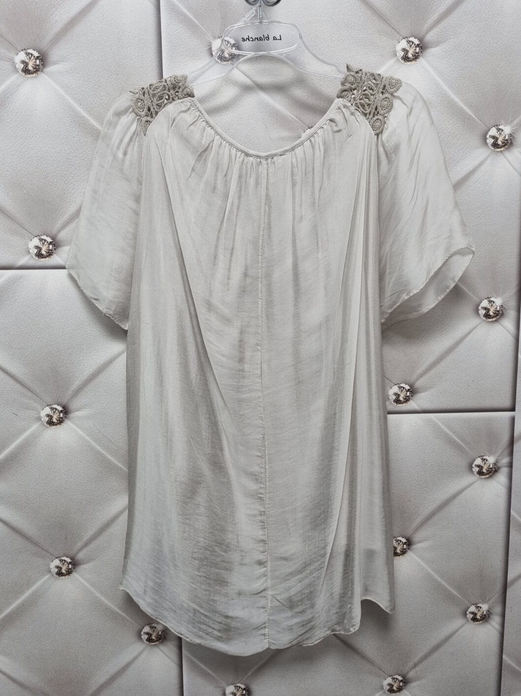 Pod spodem znajduje się miękka podszewka z wiskozy, która zapewnia komfort noszenia. Tył bluzki jest gładki, a fason rozszerzany ku dołowi, co sprawia, że model świetnie układa się na sylwetce.