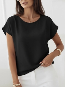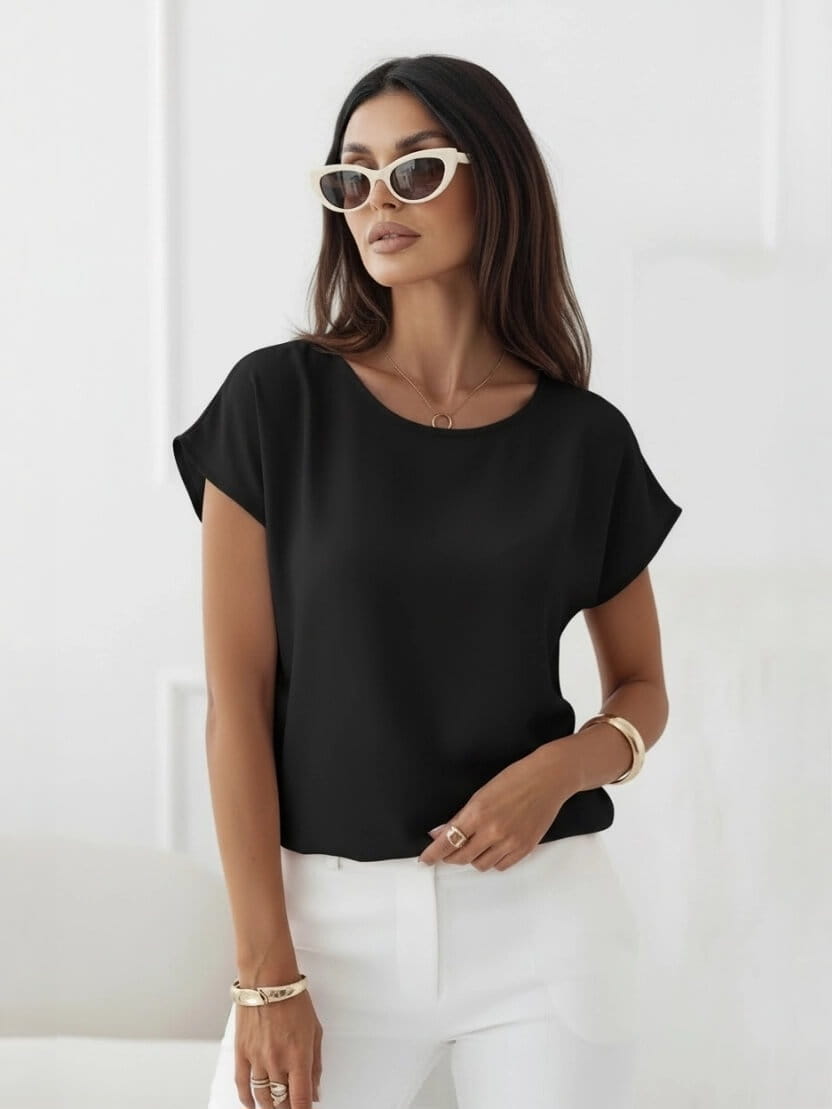 Bluzka Lila od polskiego producenta Madex to idealny wybór, jeśli lubisz rzeczy proste, ale dopracowane. Klasyczny okrągły dekolt, krótki rękaw i sprytna elastyczna gumka na dole sprawiają, że bluzka pięknie układa się na sylwetce i świetnie maskuje okolice brzucha.
