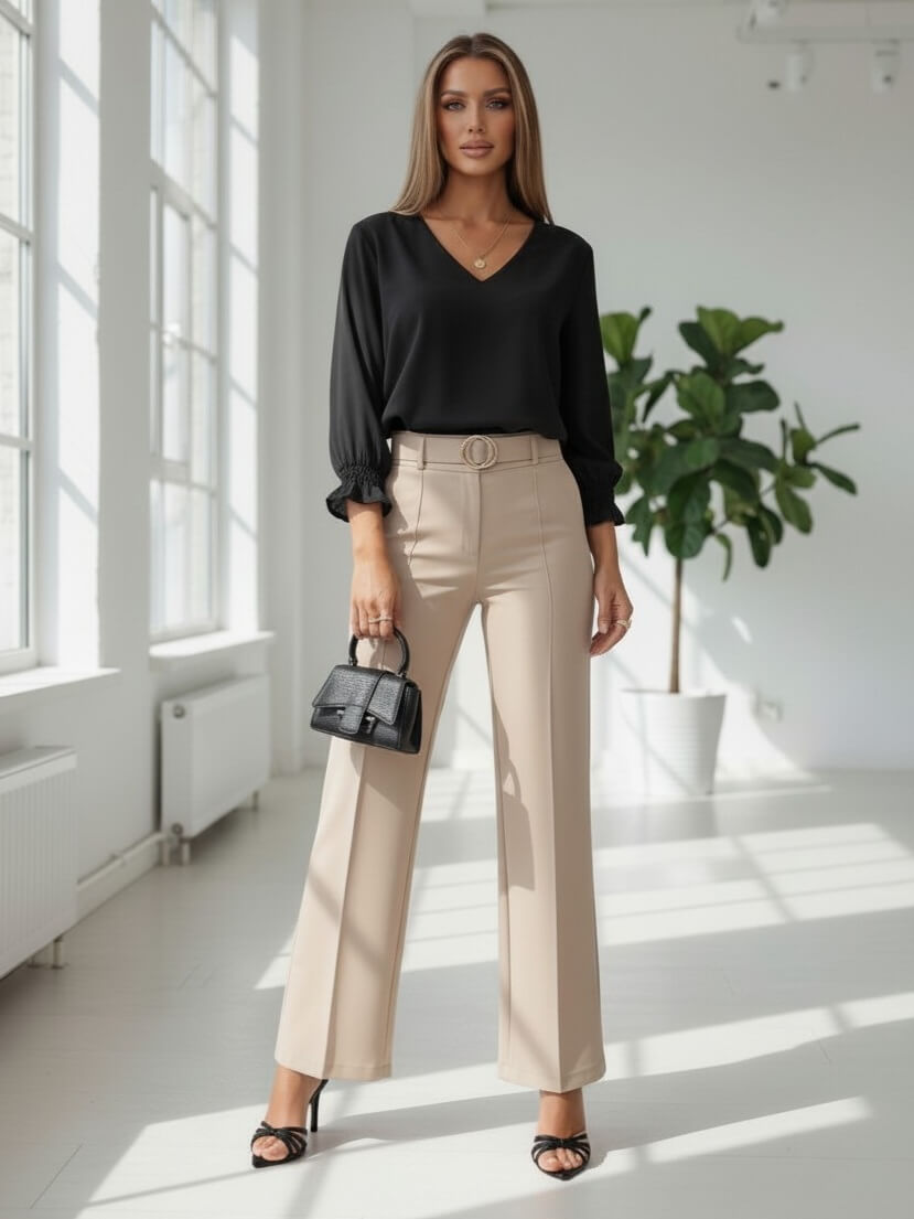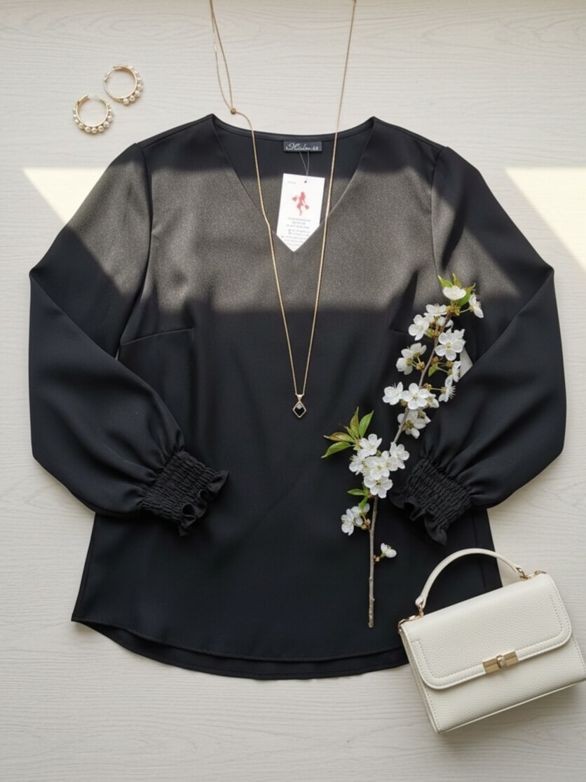 To model, który łączy elegancję i świeży, wiosenny kolor. Czarny dodaje klasy stylizacji, a kobiece wykończenie rękawów sprawia, że bluzka wygląda lekko, stylowo i pasuje zarówno do codziennych, jak i eleganckich zestawów.