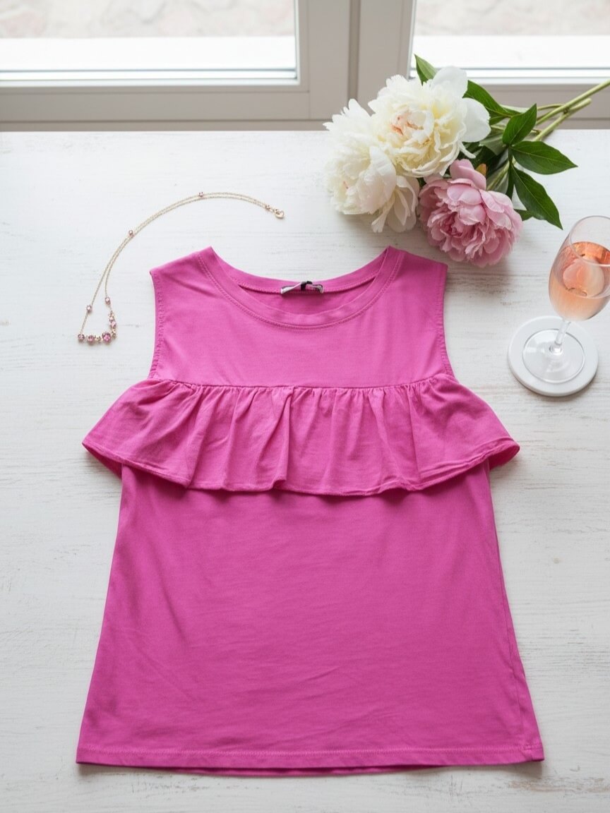 To model, który łączy wygodę naturalnej bawełny z efektownym wyglądem. Falbanka z przodu, lekko rozkloszowany fason i intensywny kolor sprawiają, że bluzka świetnie podkreśla letnie stylizacje i dodaje im lekkości.