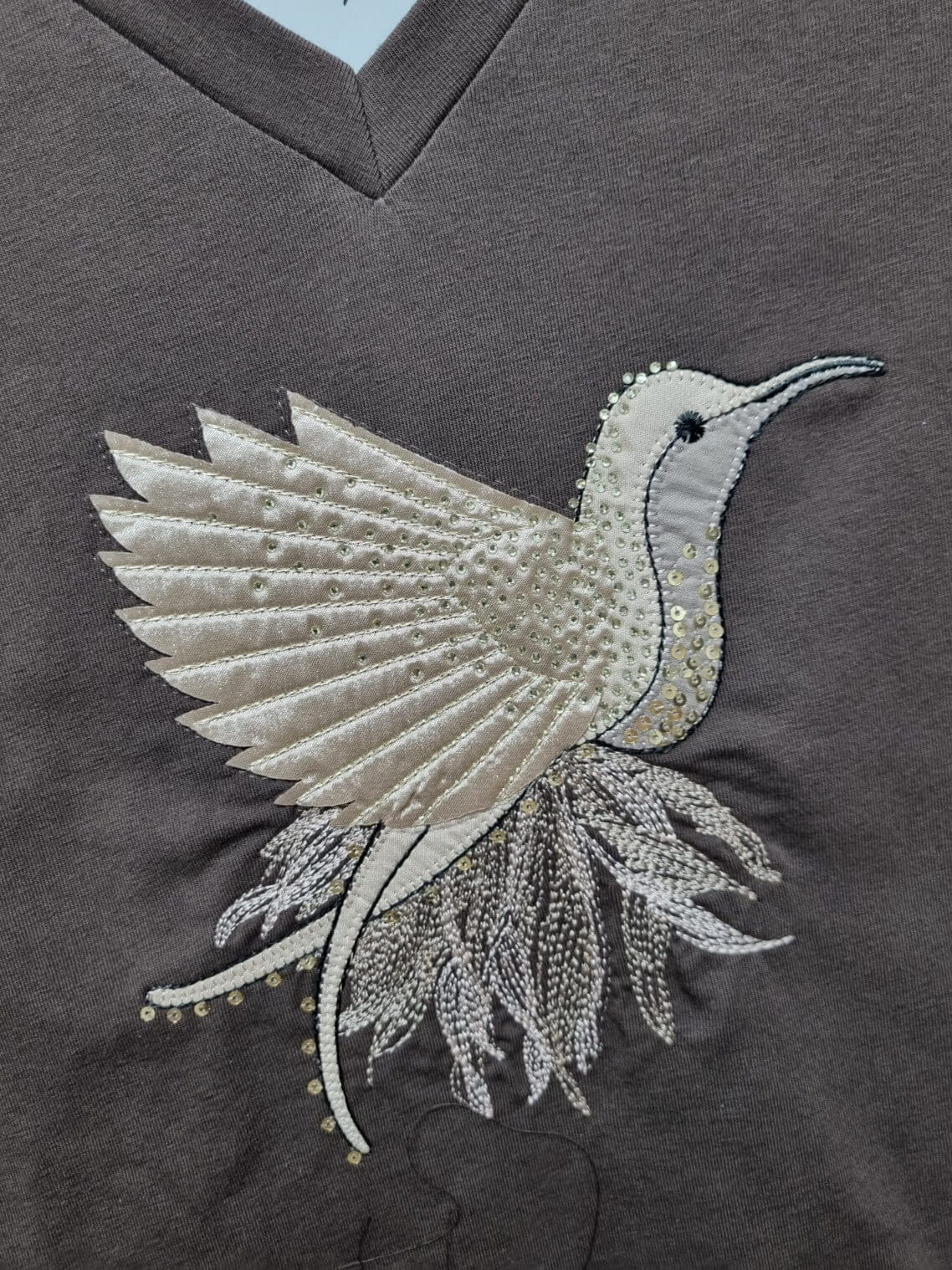 To bluzka, która robi stylizację bez wysiłku - załóż ją do jeansów, cygaretek lub spódnicy. Dekolt w serek wysmukla szyję, rękaw 3/4 jest wygodny, a aplikacja 3D dodaje efektu premium w kilka sekund.
