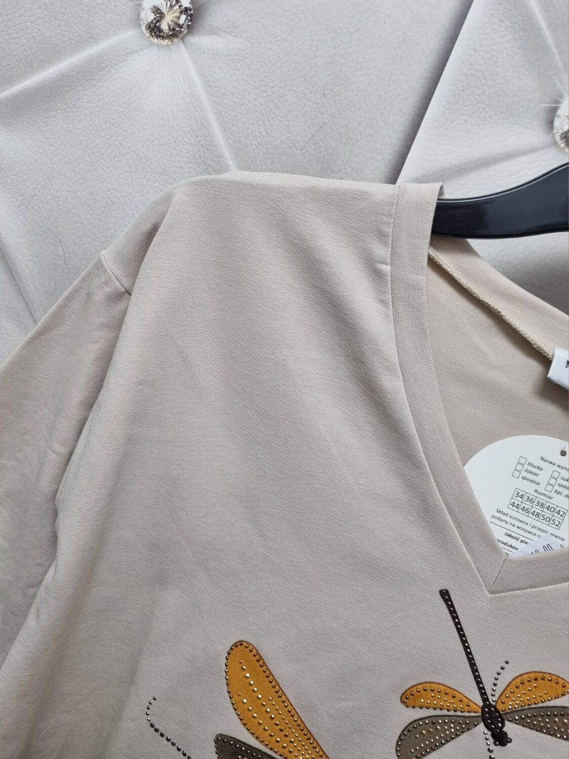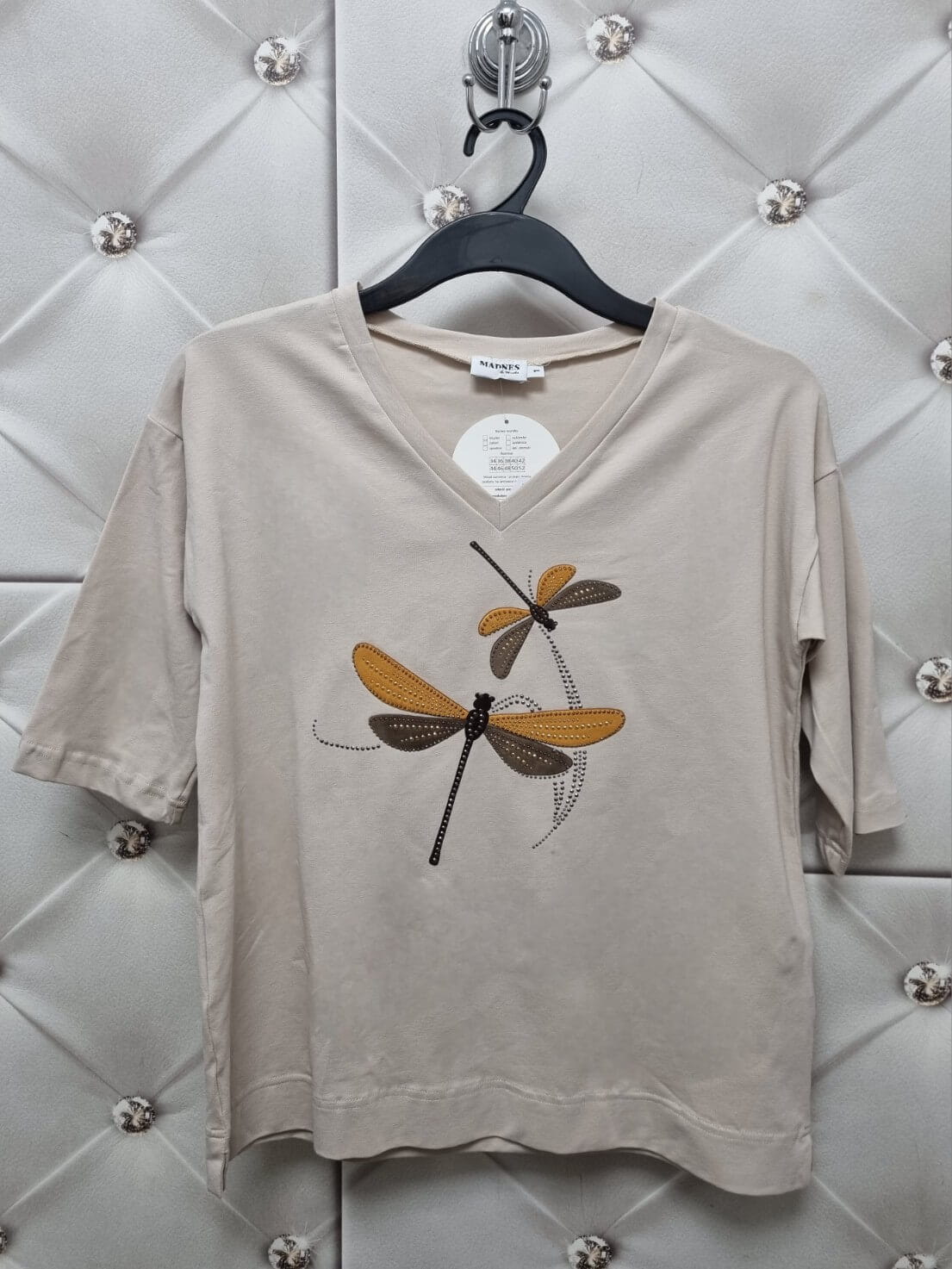 Bluzka Tshirt Madnes Ważki beżowa - dekolt V, rękaw 3/4, polska produkcja | Butik Szykownia