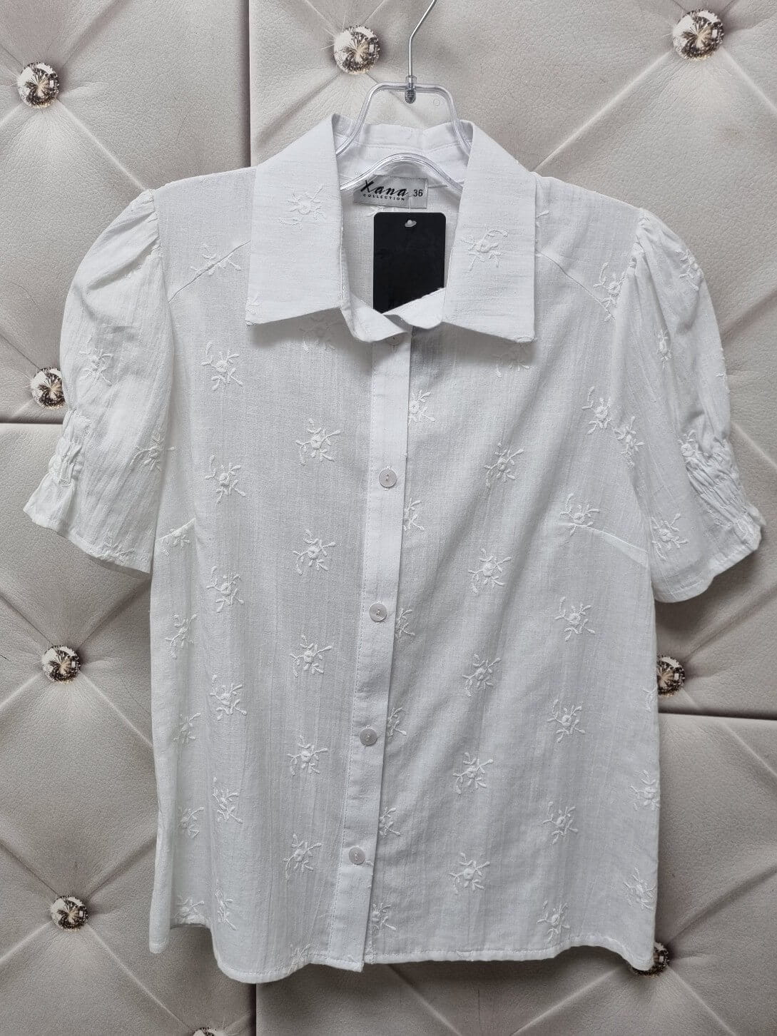 Bluzka Ażurowa. Polskiej produkcji Xana. Koszula z kołnierzykiem na krótki rękaw., zapinana z przodu na guziki. Naturalne materiały sprawiają, że poczujesz się w niej lekko i przyjemnie. Świetny model, który pasuje do spodni, spodenek, spódniczek.