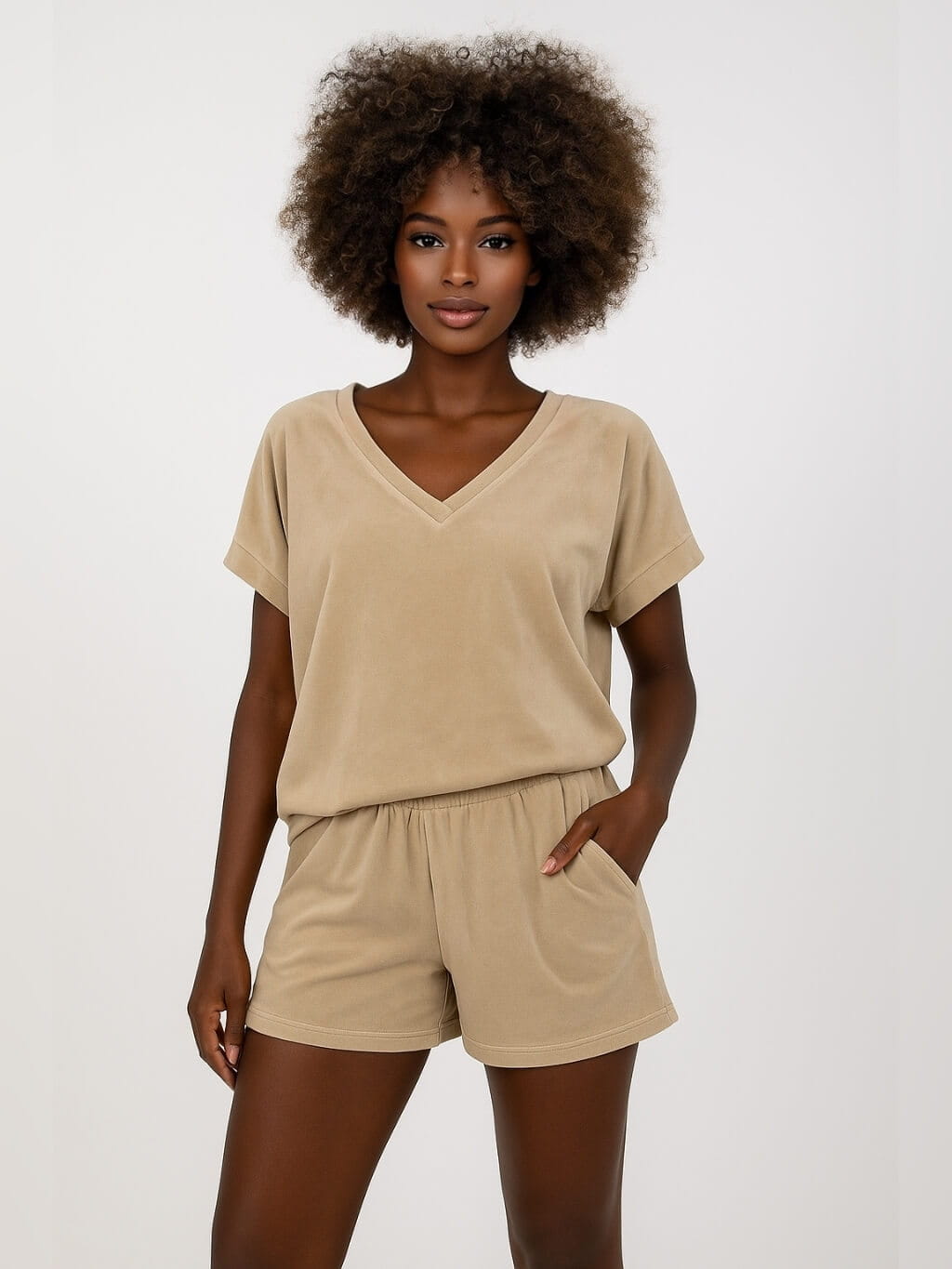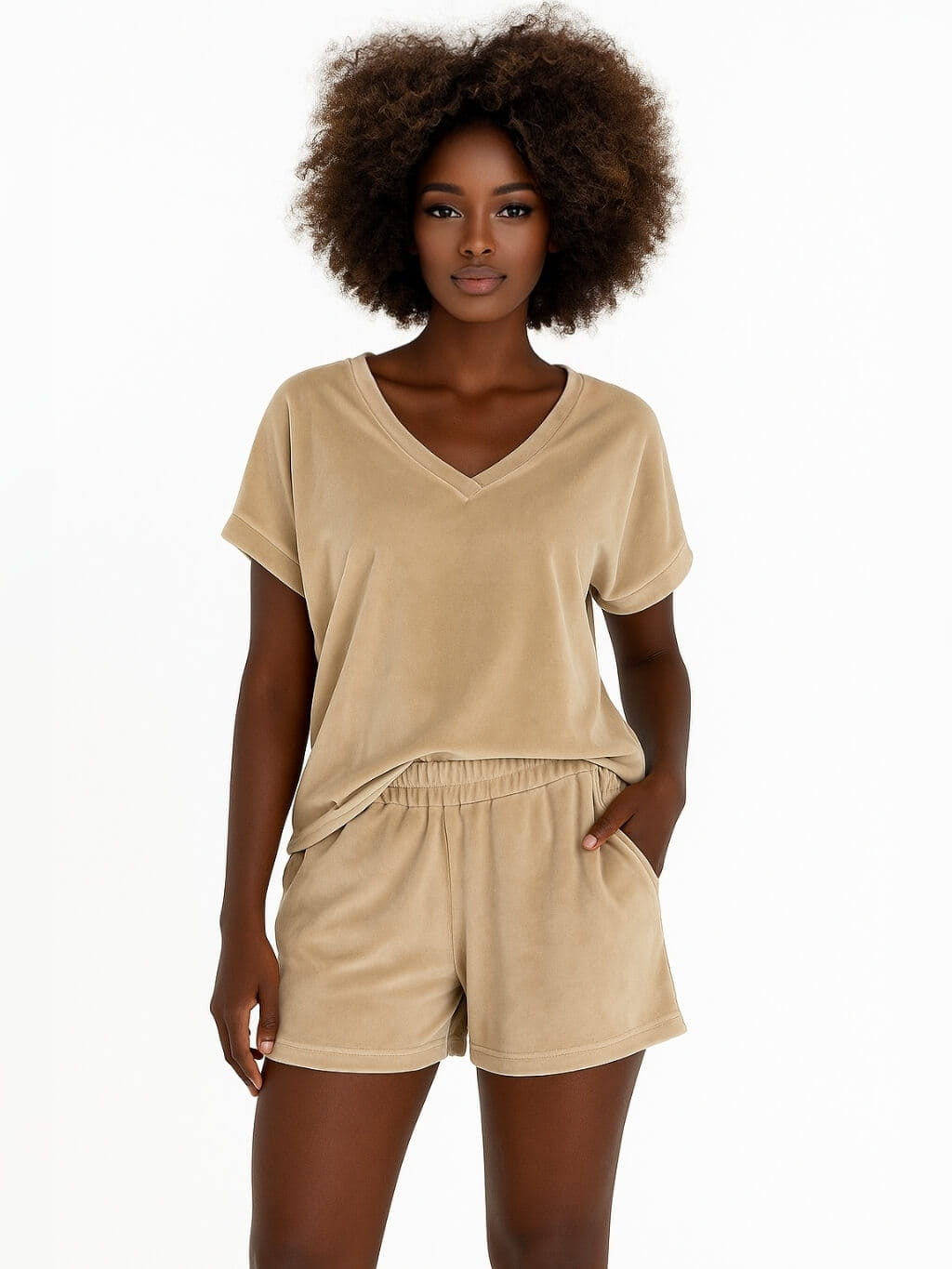 Miękki, wygodny i pełen energii komplet welurowy, idealny na letnie dni! Składa się z luźnej bluzy z dekoltem w serek i krótkim rękawem oraz wygodnych szortów na elastycznej gumie. Stylowy i komfortowy zestaw, który sprawdzi się zarówno na co dzień, jak i na wakacyjny wyjazd.