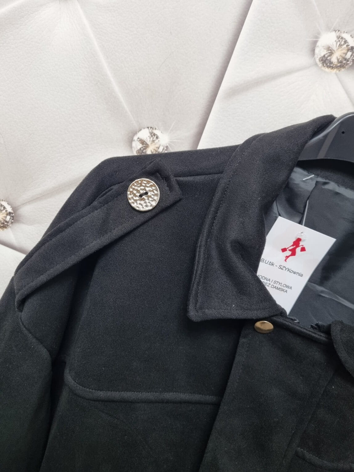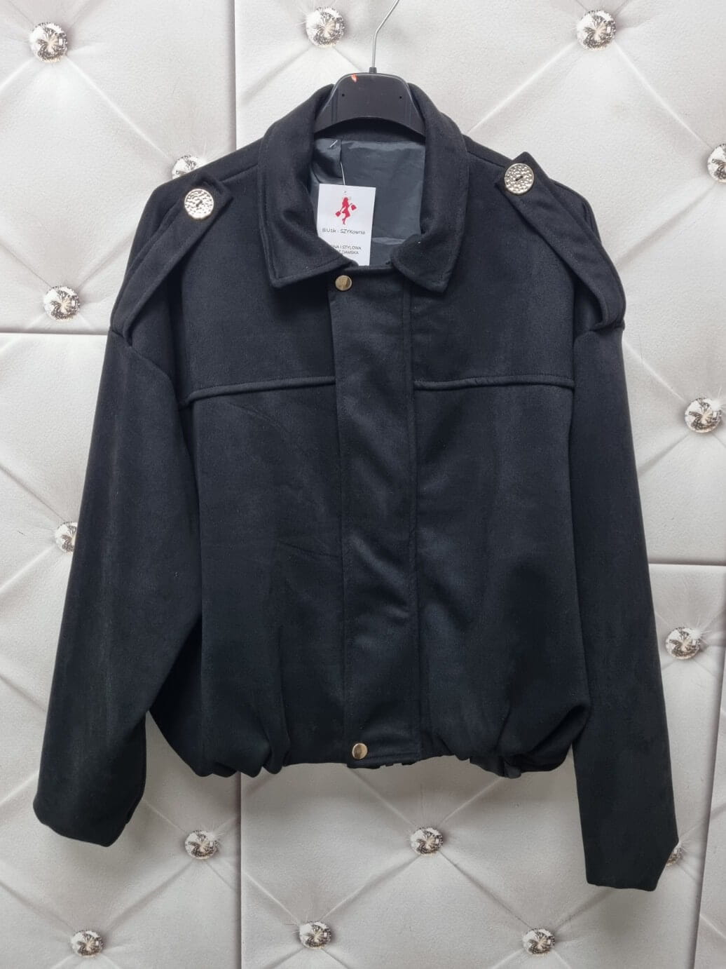 Stylowa kurtka typu bomber wykonana z miękkiej tkaniny ala zamsz. Model z kołnierzykiem, zapinany na patkę z dwoma zatrzaskami oraz zamek błyskawiczny pod spodem. Na ramionach pagony z patkami zapinanymi na złote guziki. Dwie kieszenie po bokach. Rękawy są szersze, zakończone elastycznymi gumkami, dzięki czemu materiał miękko się układa. Dół kurtki wykończony elastyczną gumką. Od środka na całości podszyta podszewką. Fason oversize – wygodny i nowoczesny.