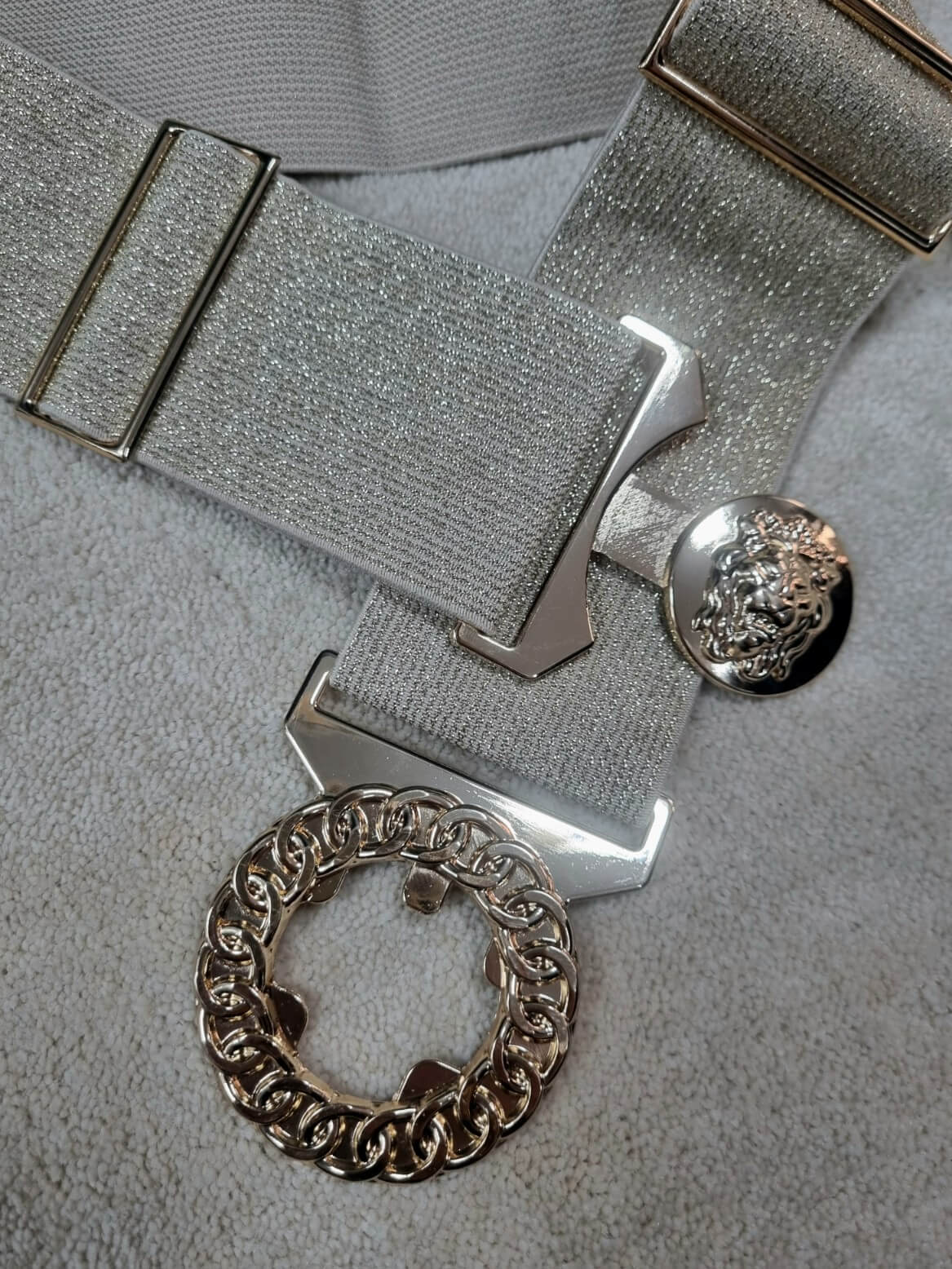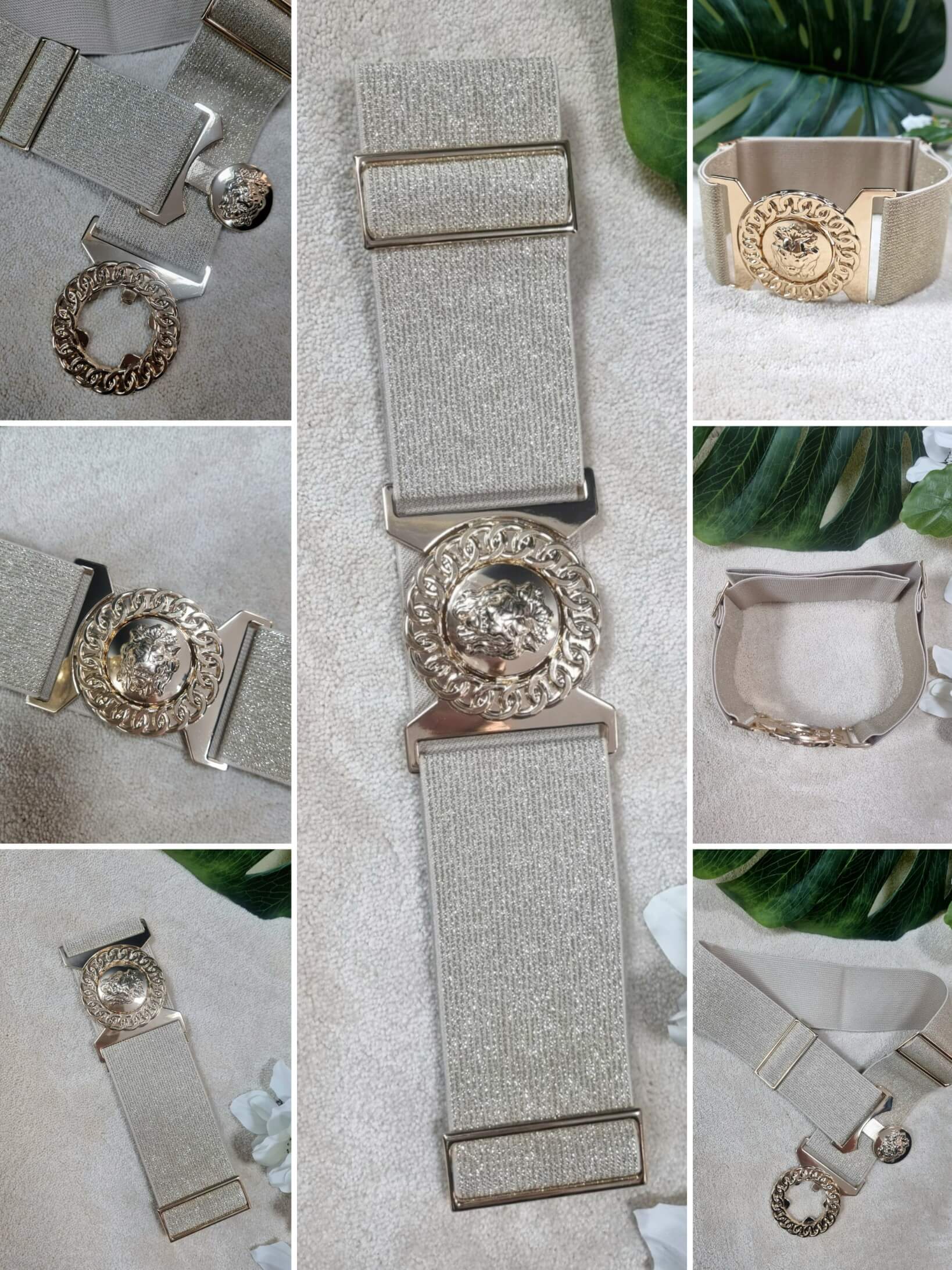 Wyrazisty dodatek z szerokiej, elastycznej gumy i efektowną srebrną klamrą. Ozdobne koło z łańcuszkowym rantem skrywa w centrum głowę lwa, co nadaje paskowi biżuteryjnego, eleganckiego charakteru. Konstrukcja z regulacją po obu stronach pozwala precyzyjnie dopasować długość do sylwetki. Świetnie sprawdzi się do sukienek, swetrów, spodni oraz kurtek.