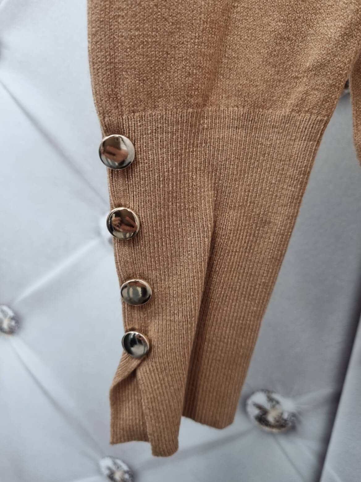 Bluzka-sweterek N.Every Day uszyta z cienkiej, elastycznej dzianiny, która jest miękka i przyjemna w dotyku. Półgolf subtelnie otula szyję, a dół wykończony ściągaczem zapewnia ładne ułożenie na sylwetce. Rękawy zdobią małe rozcięcia i cztery złote guziki – dyskretny detal, który dodaje szyku. Idealny pod marynarki, kamizelki i do solo stylizacji.