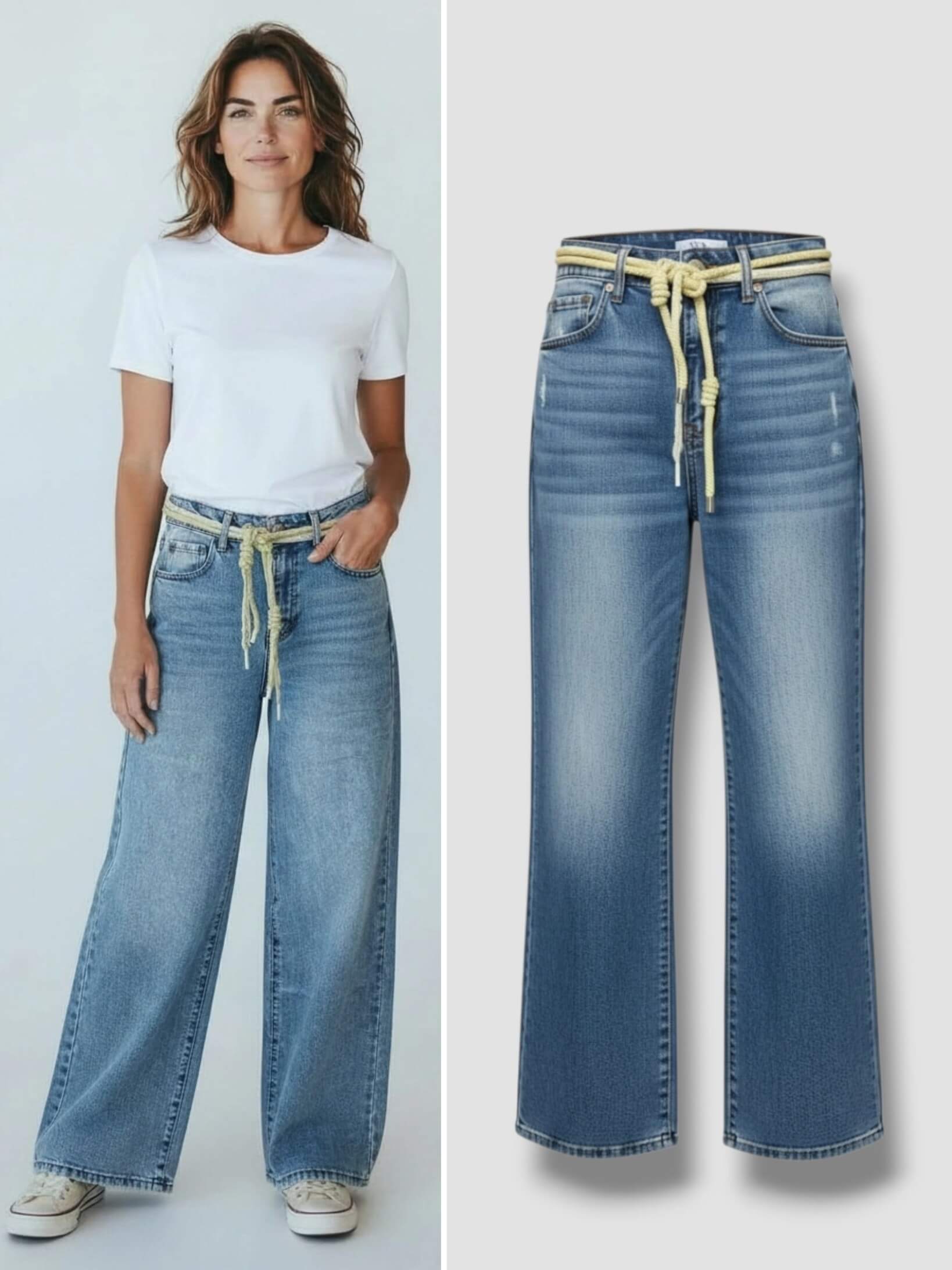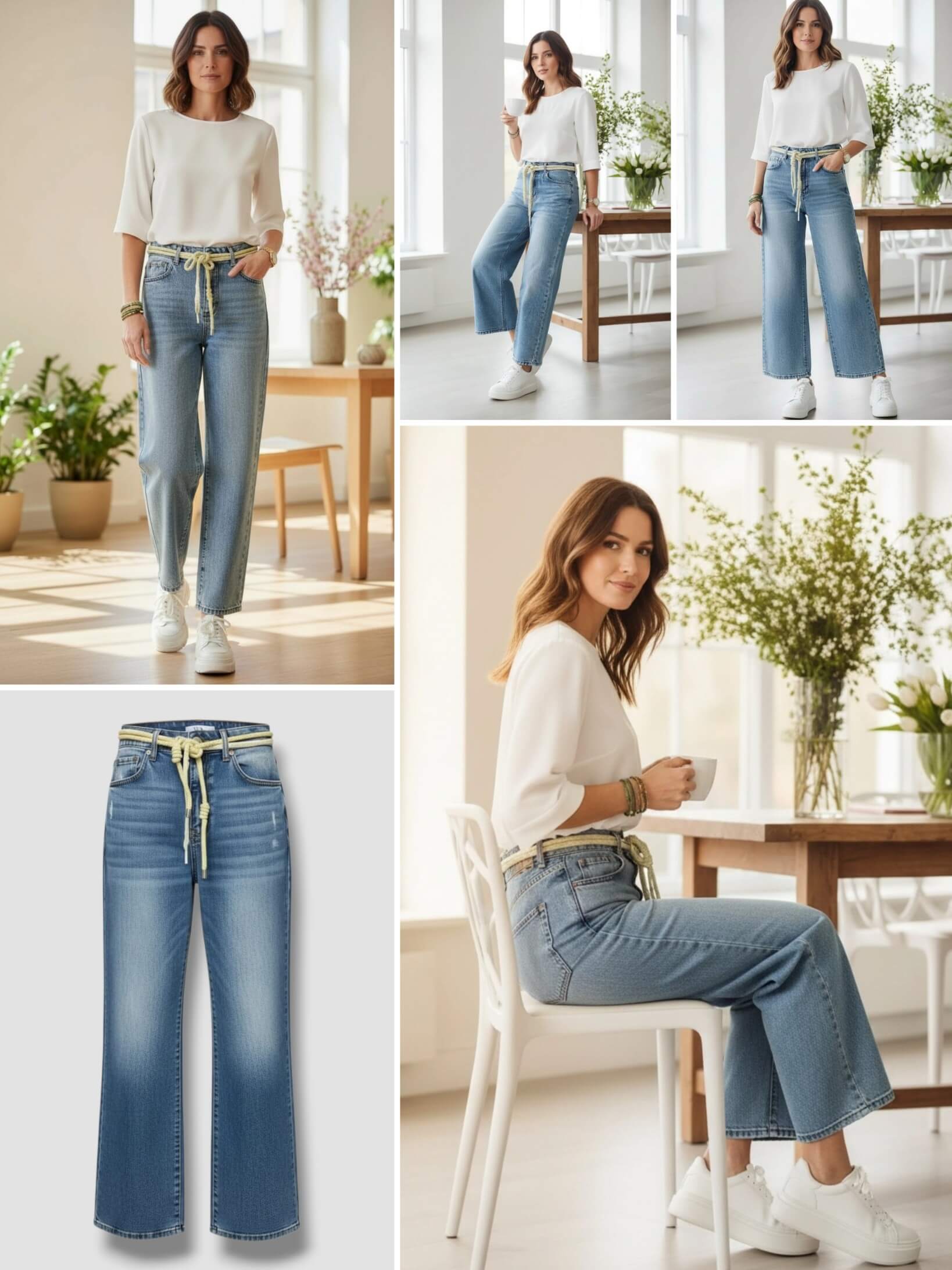 Jeśli szukasz jeansów, które wysmuklają sylwetkę i robią efekt „długich nóg”, ten model będzie idealnym wyborem. Fason Wide Leg pięknie układa się w ruchu, a pastelowy zielony pasek sznurkowy dodaje stylizacji lekkości – idealnie wpisując się w wiosenną kolekcję.