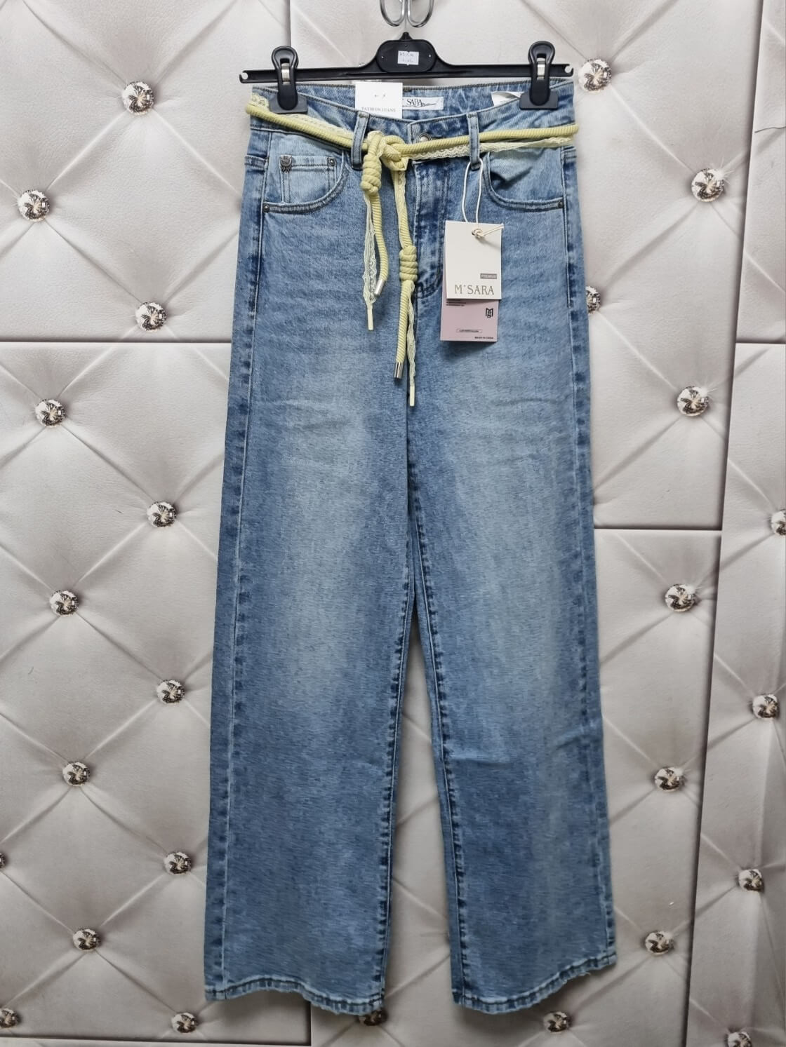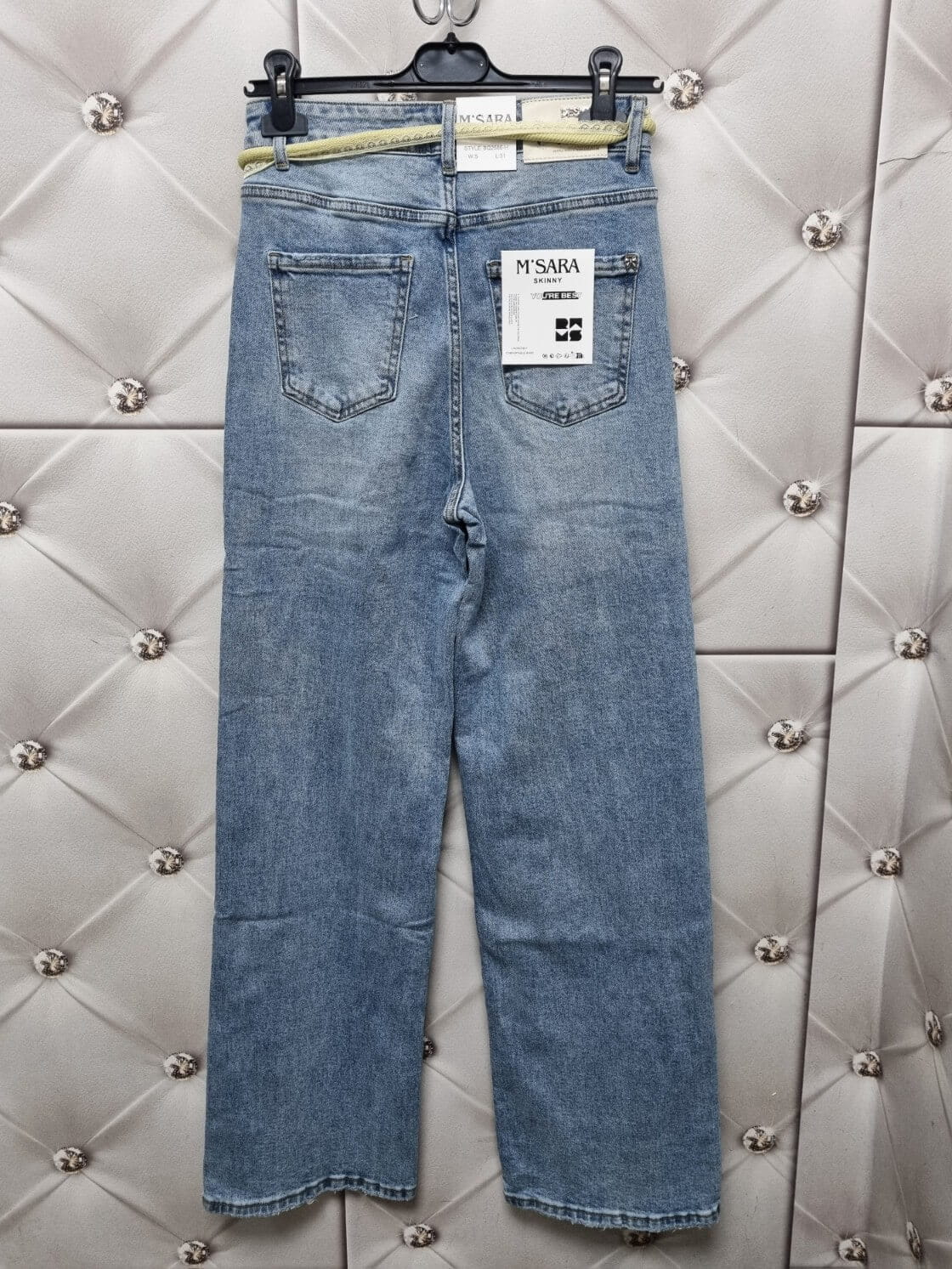 Spodnie Jeansy M.Sara Wide Leg BQ2686-H niebieskie przecierane - pasek sznurkowy zielony | Butik Szykownia