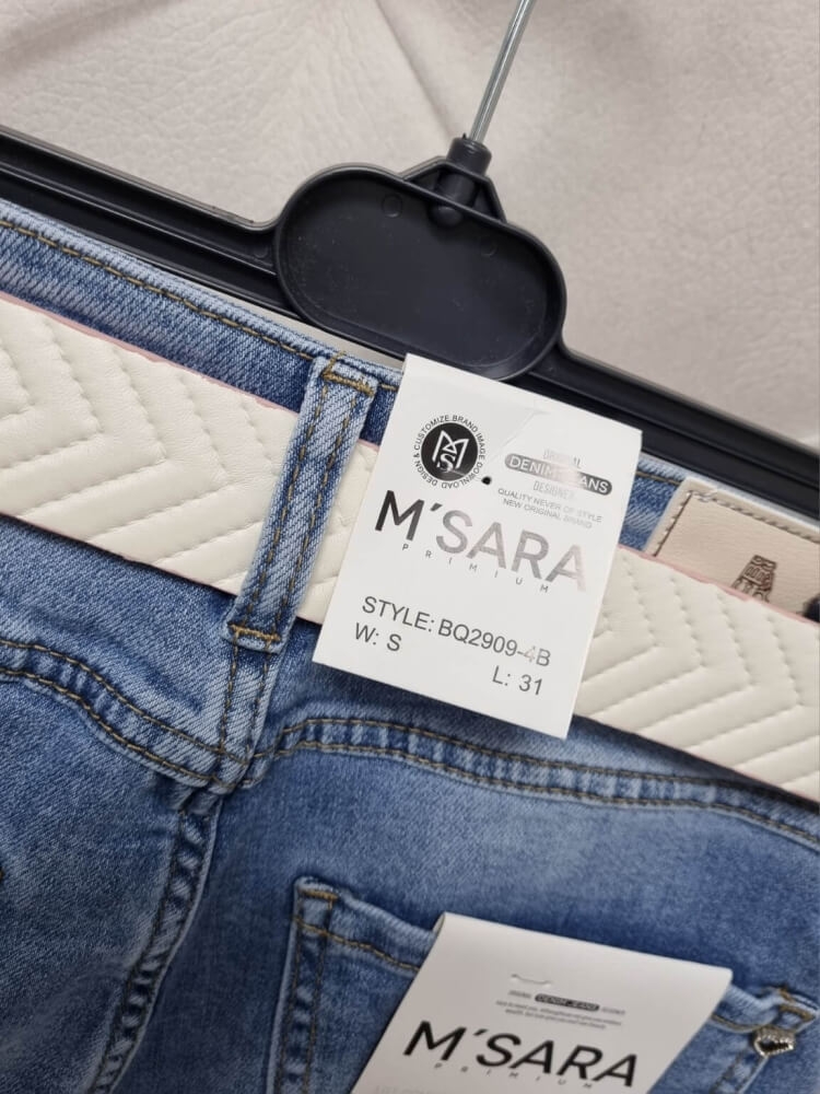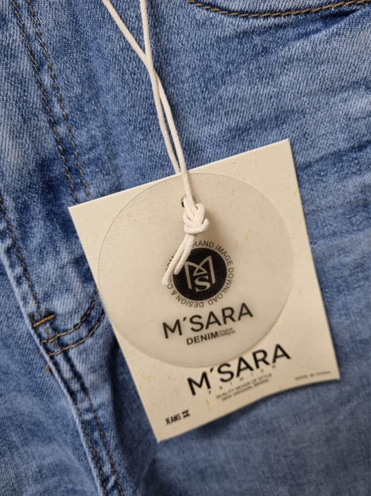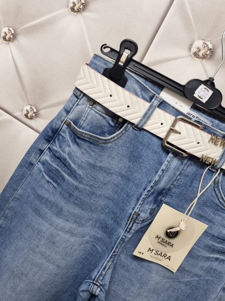 Jeansy M.Sara w modnym fasonie Wide Leg to propozycja, która łączy wygodę z nowoczesnym wyglądem. Szeroka nogawka pięknie układa się na sylwetce, optycznie wydłużając nogi. Model wyróżnia się klasycznym jeansowym kolorem z delikatnymi przetarciami oraz białym paskiem ze srebrną klamrą, który stanowi stylowe uzupełnienie całości.