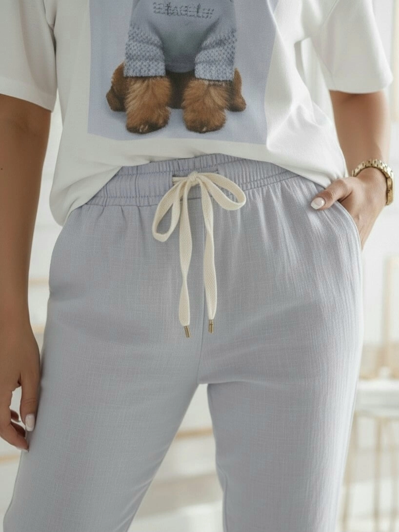 Model posiada szeroką, marszczoną gumę w pasie oraz praktyczny troczek do regulacji. Spodnie mają dwie kieszenie z przodu i dwie kieszenie z tyłu. Nogawki świetnie prezentują się również po podwinięciu, dzięki czemu można łatwo dopasować je do sneakersów, mokasynów czy sandałków.