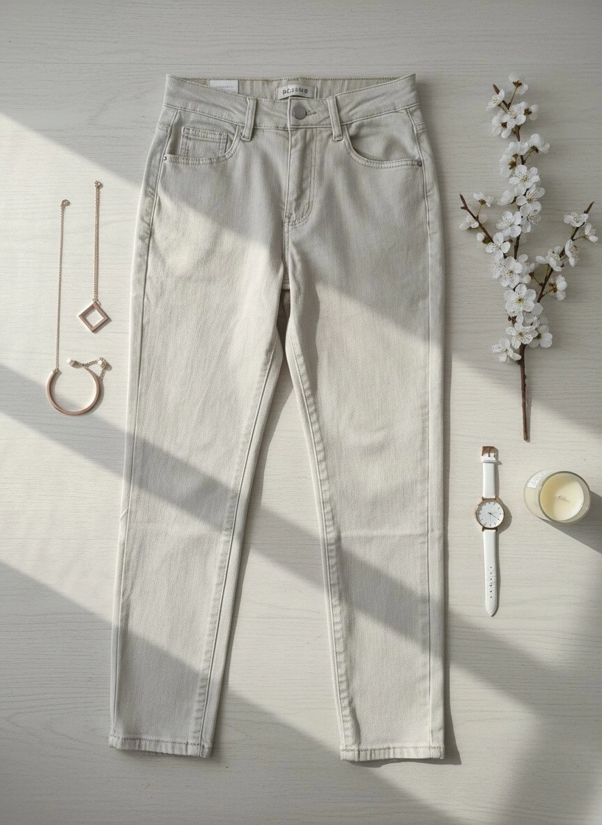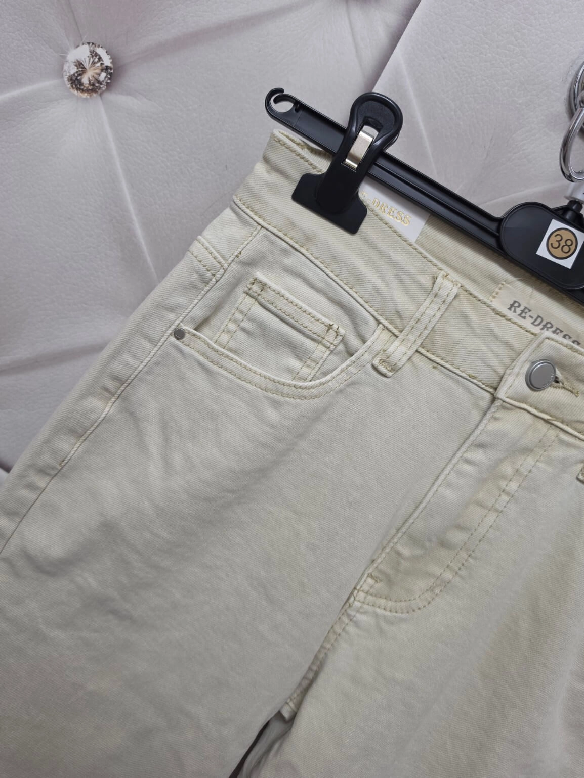 Spodnie jeansowe Re-Dress Model RE3101-2 to elastyczny model w fasonie Mom Fit, który łączy wygodę codziennego noszenia z modnym, kobiecym krojem. Bardzo jasny beż pięknie rozświetla stylizację i świetnie wpisuje się w sezon wiosenno-letni.