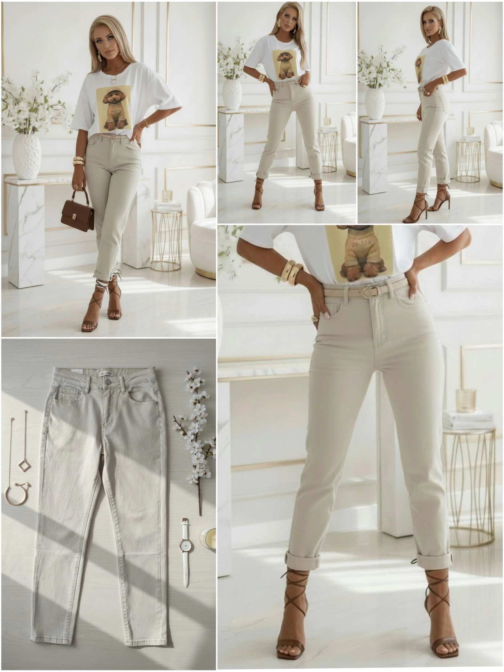 To spodnie, które pięknie odświeżają codzienne stylizacje. Bardzo jasny beż wygląda lekko i elegancko, a fason Mom Fit sprawia, że model świetnie łączy wygodę z modnym wyglądem. Idealne do T-shirtu, koszuli, sweterka albo marynarki.