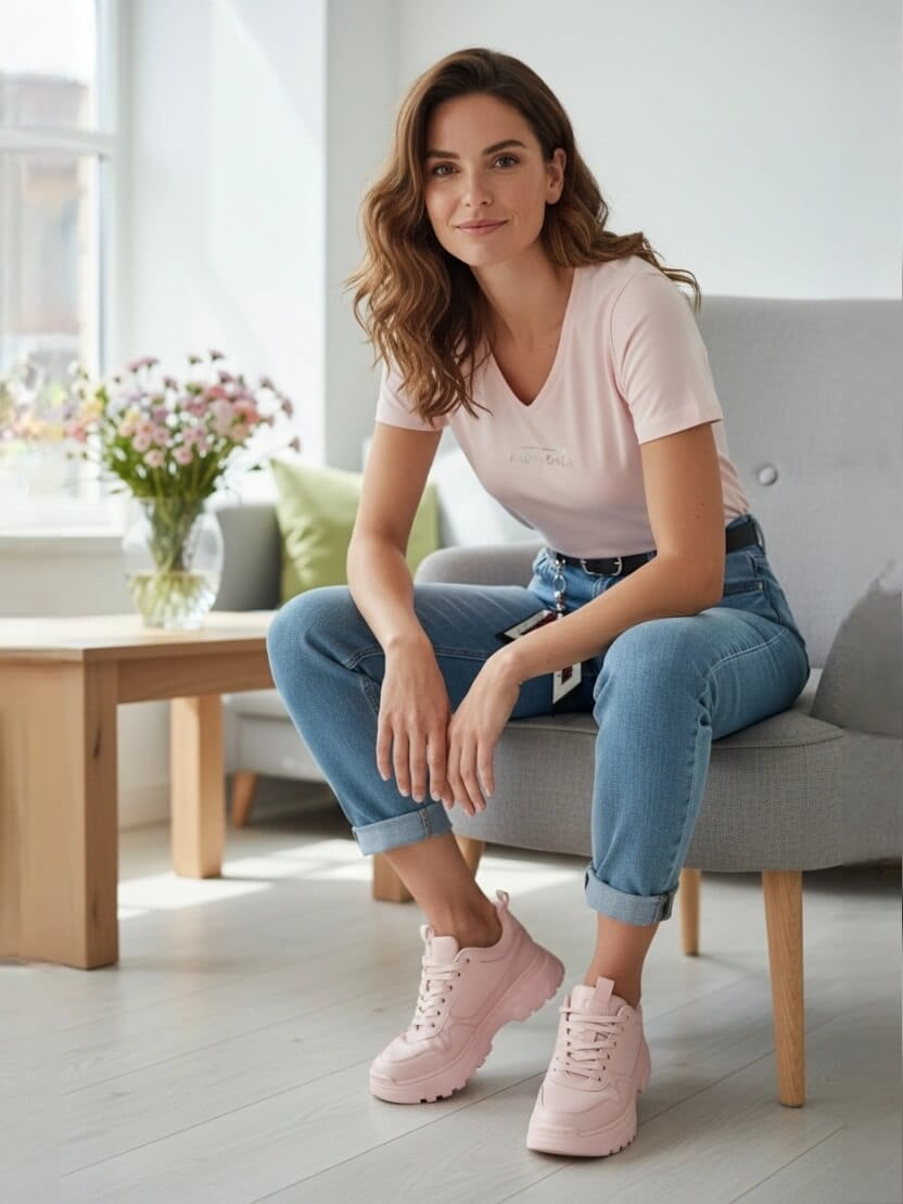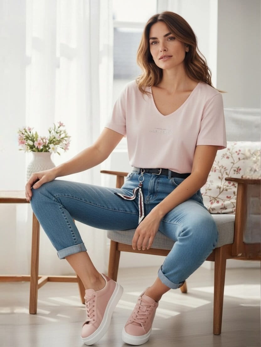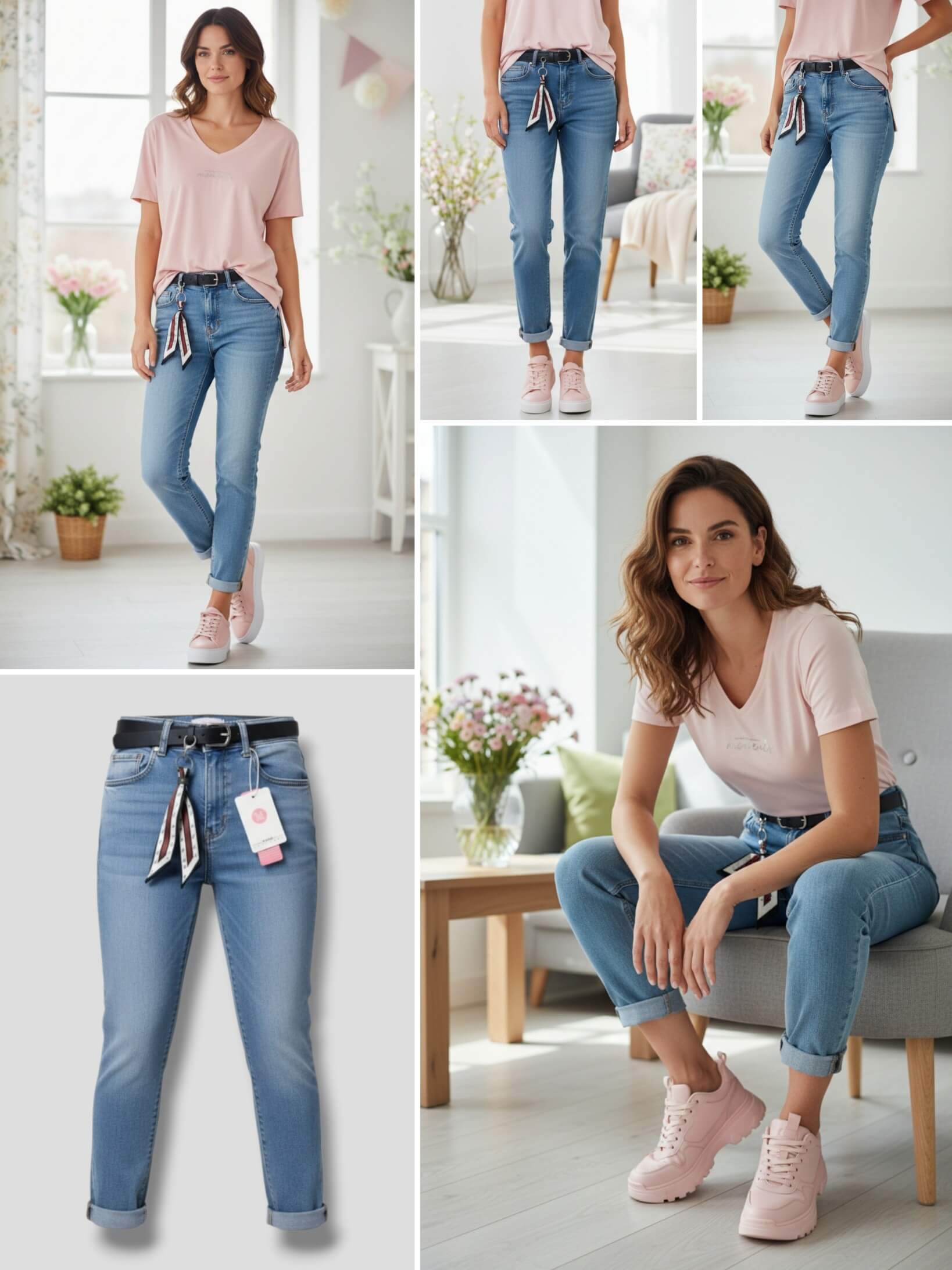 To model, który od razu wygląda „zrobiony” - pasek i apaszka dodają charakteru, a krój Mom Fit zapewnia wygodę. Idealne na wiosenne dni, gdy chcesz wyglądać stylowo bez wysiłku.