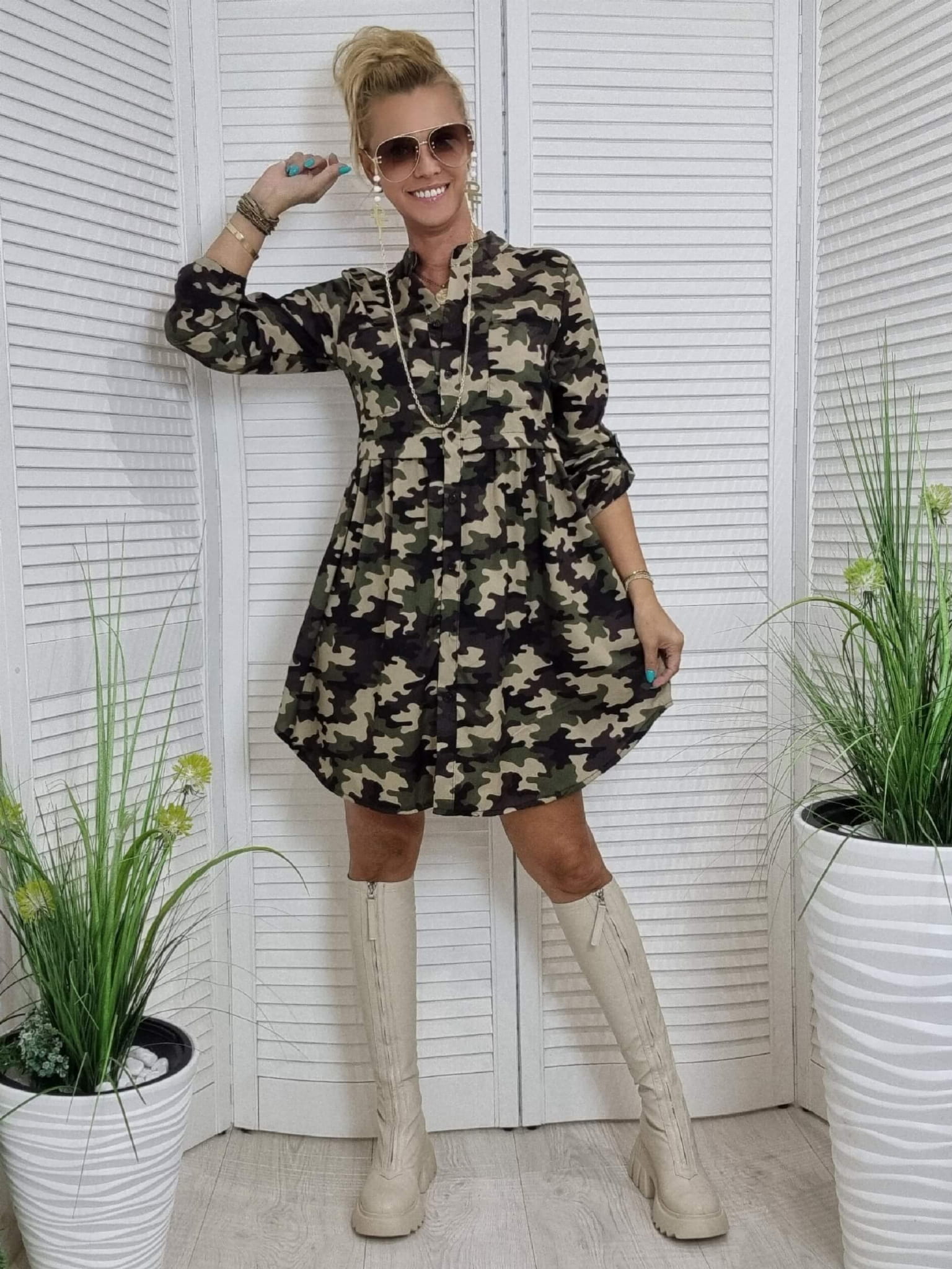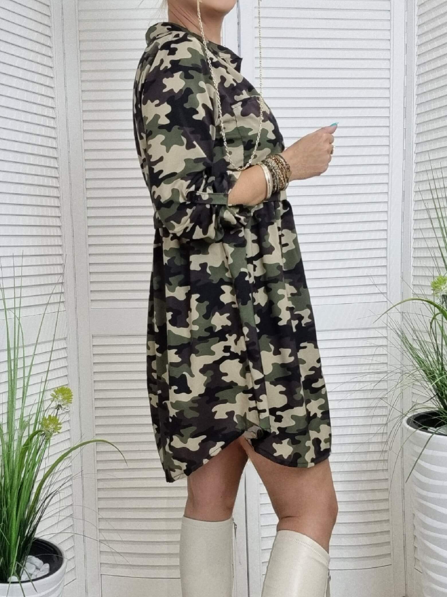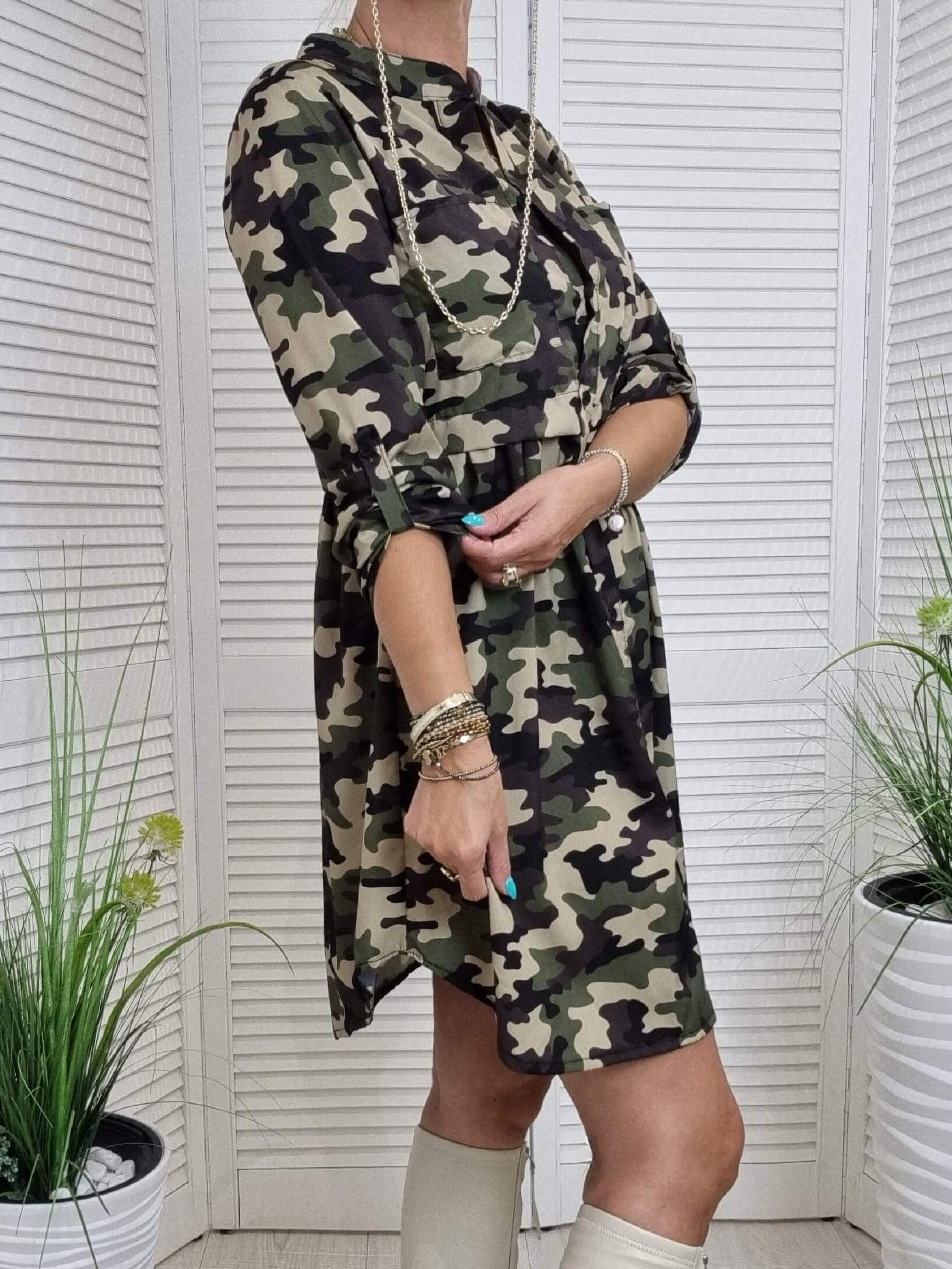 Sukienka Istory. Włoskiej Produkcj. Najnowsza Kolekcja charakteryzuje się nietuzinkowymi wzorami które królują w tym sezonie. Posiada małą stójkę oraz mały dekolt w serek, zapinana z przodu na 4 guziki. W pasie odcięcie z patki. Rękaw długi z możliwością podpięcia. Przód i tył dłuższy, boki krótsze. Model świetnie prezentuje się z różnymi rodzajami kozaków oraz botkami.