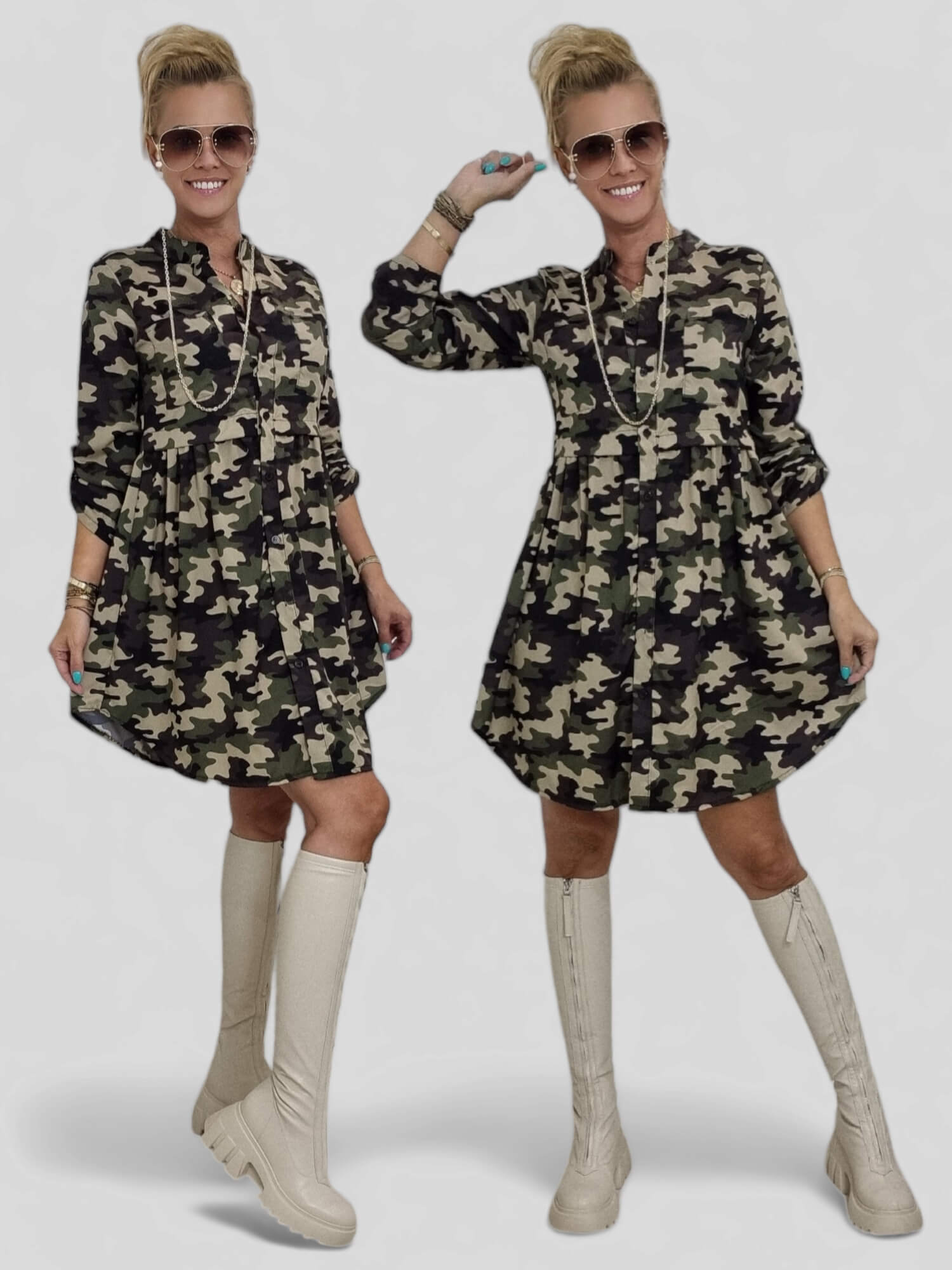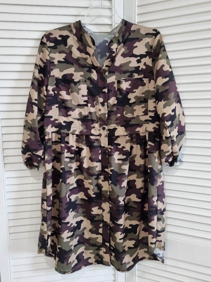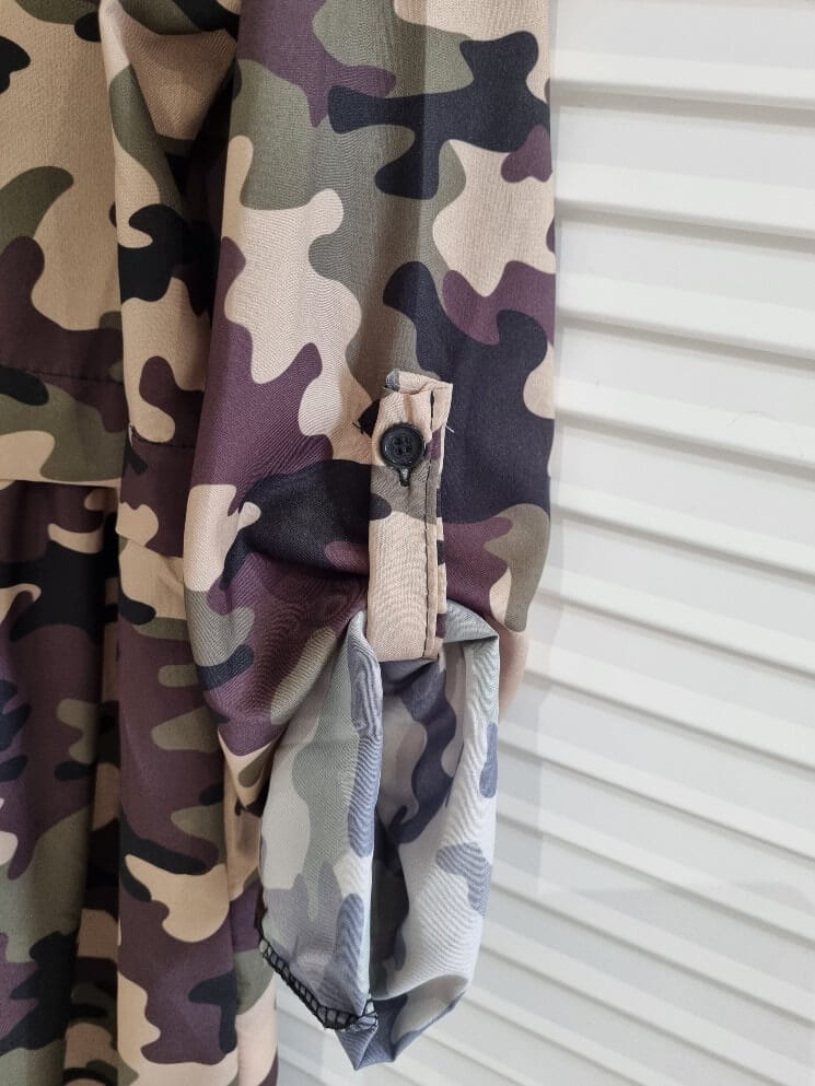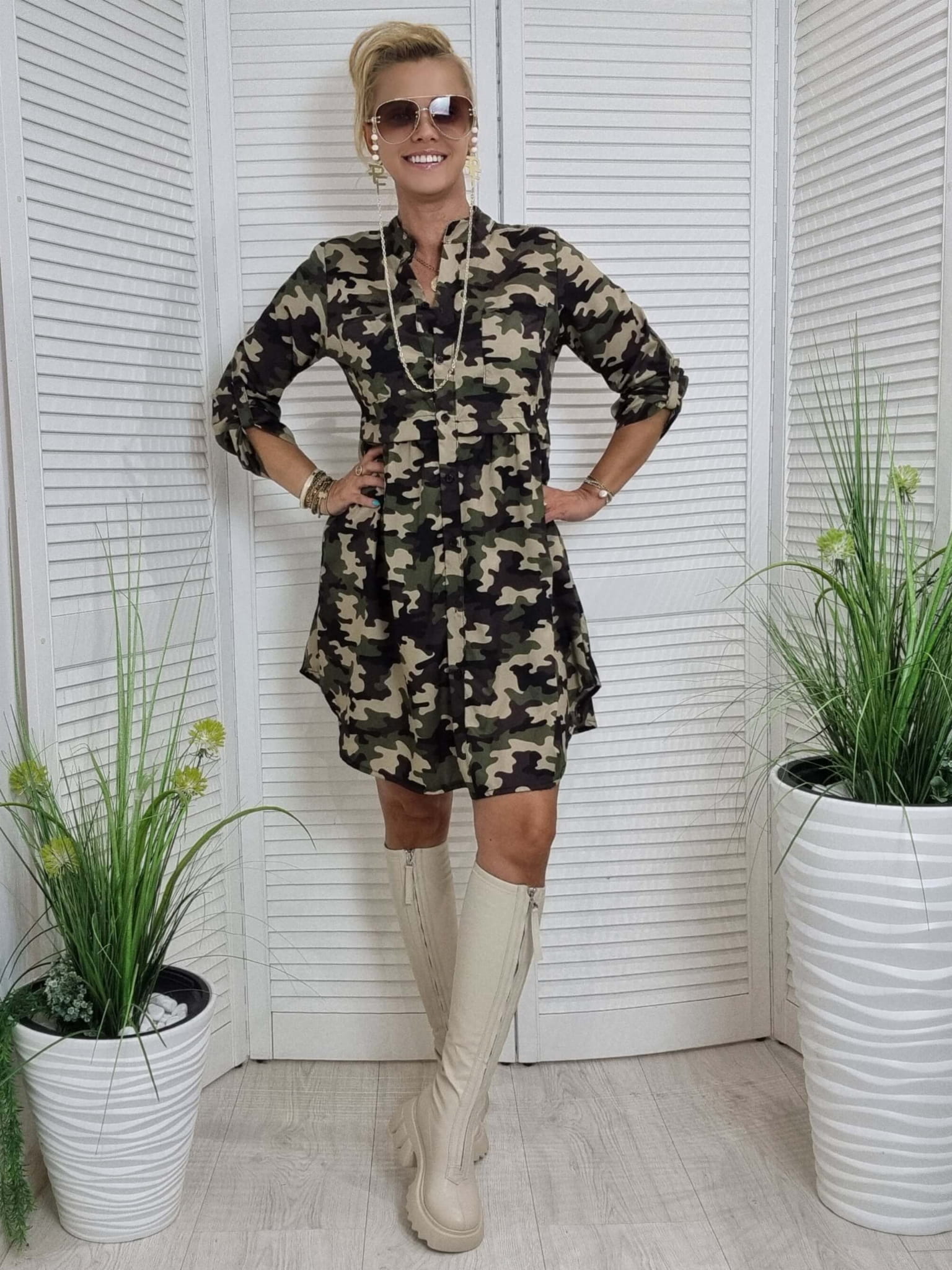 Sukienka Istory. Włoskiej Produkcj. Najnowsza Kolekcja charakteryzuje się nietuzinkowymi wzorami które królują w tym sezonie. Posiada małą stójkę oraz mały dekolt w serek, zapinana z przodu na 4 guziki. W pasie odcięcie z patki. Rękaw długi z możliwością podpięcia. Przód i tył dłuższy, boki krótsze. Model świetnie prezentuje się z różnymi rodzajami kozaków oraz botkami.